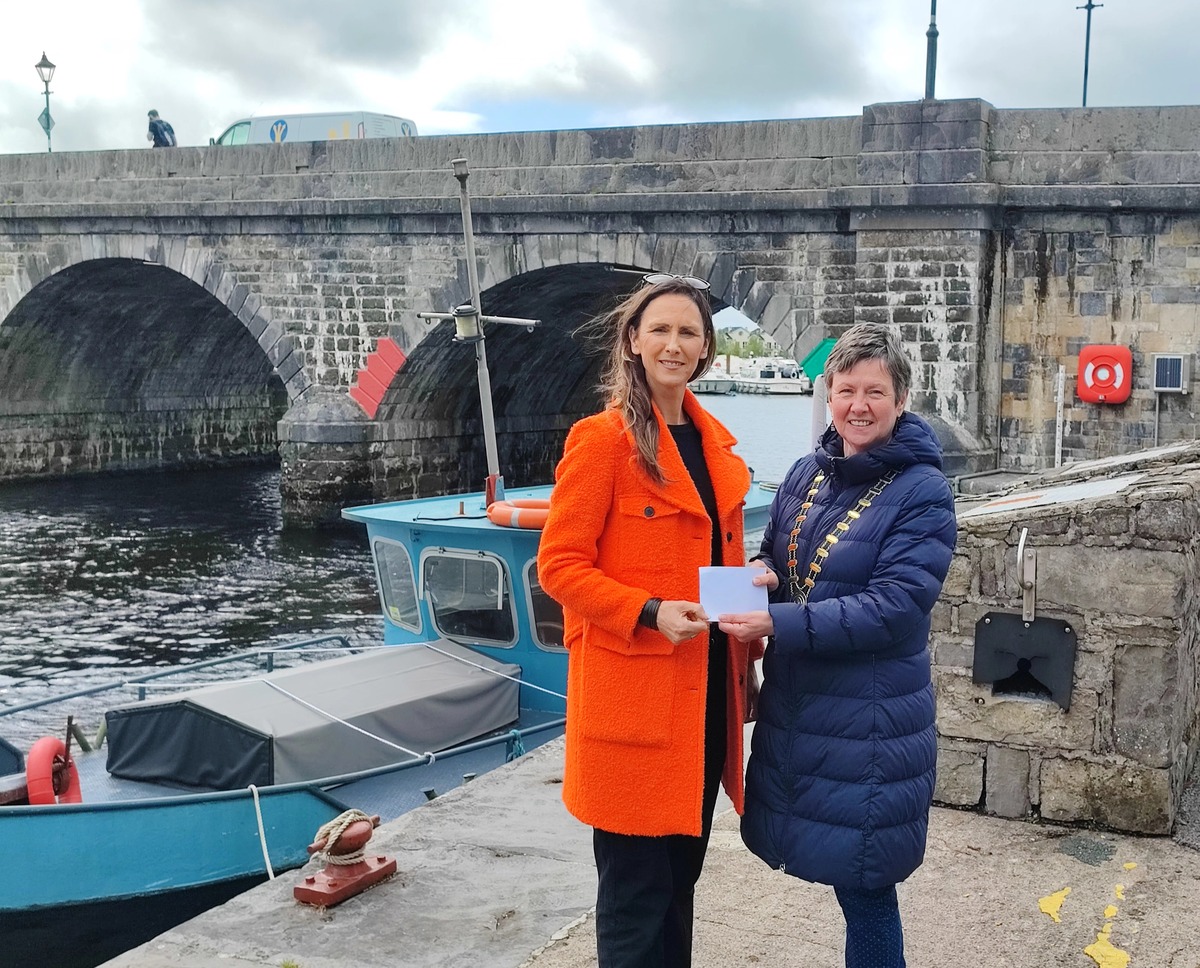 Carrick-on-Shannon Chamber of Commerce President Finola Armstrong McGuire presents Aoife McCormack of the SRC with a donation of €10,000 in support of the all-inclusive community focused development.